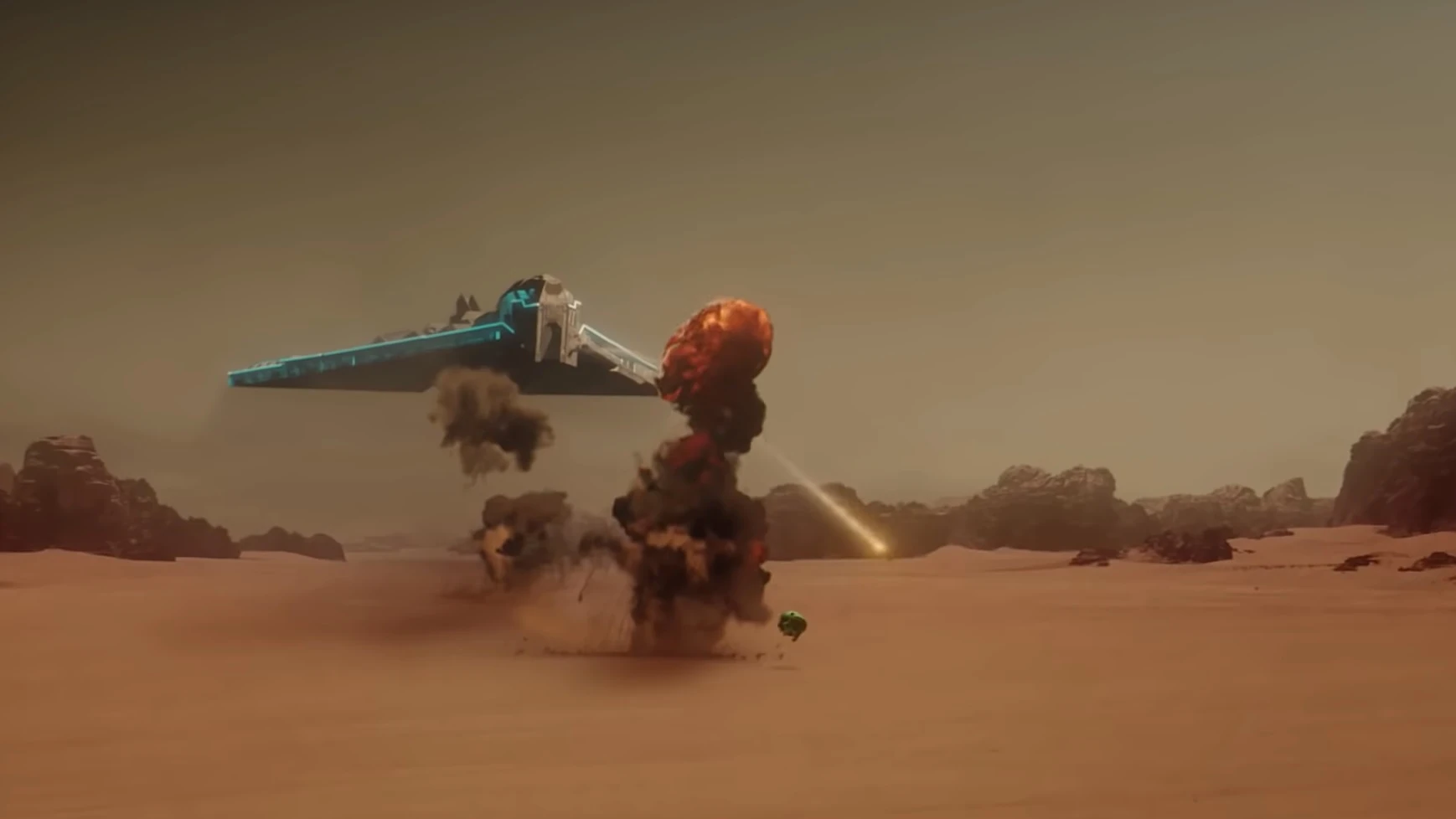 Iron Star (left) is approached by Starbug (right) in orbit around the desert planetoid.