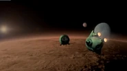 Holly came up with a very precarious plan - he would fire a nuclear mining torpedo at the moon to blow it to smithereens. Since Starbug is quite tough, it may survive the blast and may be thrown free of the moon. With no other options available to them, the Dwarfers agreed. The first missile completely missed the moon, since Holly's calculations were completely wrong. The second missile, however, blew the moon into pieces and luckily Starbug was thrown free of it.