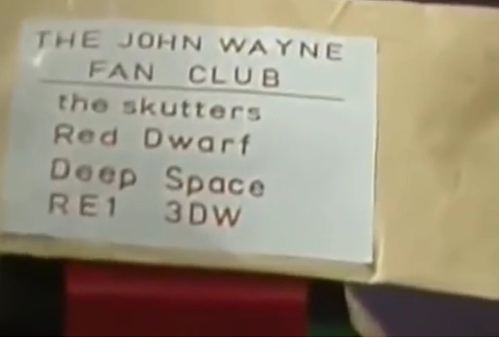 When the ship is heading back to Earth, Red Dwarf catches up with a three million year old mail pod. Among the masses of personal mail, junk mail and entertainment items, and John Wayne fan club mail addressed to the skutters. The Skutters are later seen dressed as little cowboys and Indians, firing off little pistols. ("Better Than Life", Series II)