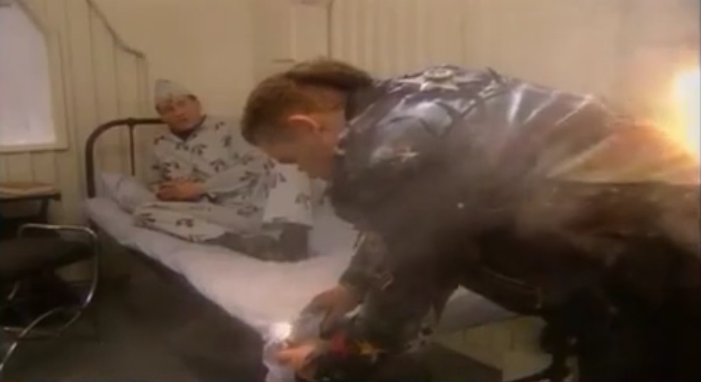An imprisoned Rimmer explains how the Justice Zone works by getting Lister to set fire to the bedsheets, which instead sets fire to Lister's jacket.