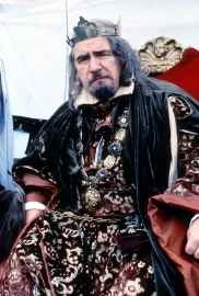 The King was a large, middle aged man with a paunch. He had a beard and long hair under his coronet and was considerably older than his young Queen. He spoke with a refined English accent, in contrast to the Queen's French accent. His royal robes were richly adorned and obviously expensive.