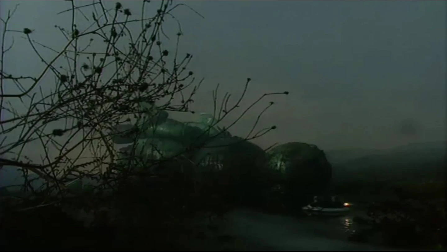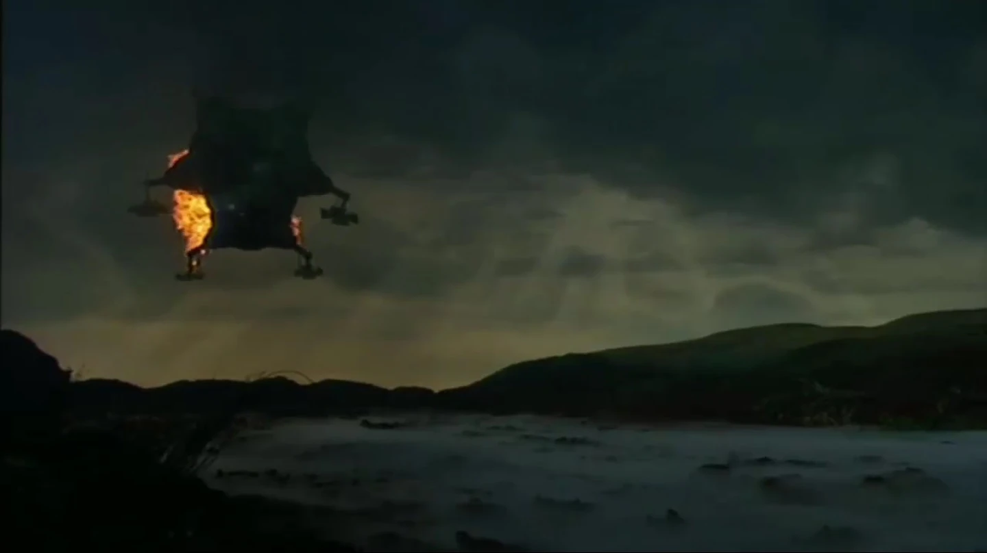 After being chased by a Space Corps Enforcement Orb, Starbug was nearly destroyed by pulse missiles. However the boys from the Dwarf were saved when they flew Starbug into the eye-socket of the GELF icon, which was destroyed but shielded Starbug in the process. As they flew into the GELF Zone, the Enforcement Orb gave up the chase. With Starbug on fire and about to blow, they had no choice to crash land in the nearby Kinitawowi moon since it has an ocean, and successfully crashed into a swamp that put out the fires. Auto-repair was able to take care of most of the damage, but they still needed a new Oxy-Generation Unit and so were forced to take a canoe out to the Kinitawowi village.