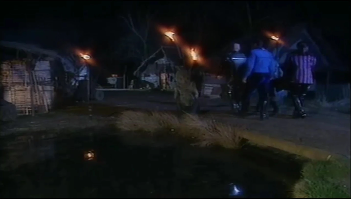 Dave Lister had to cut through high reeds with a machete from them to proceed. A arrow pierces their wares which they are taking to trade with the GELFs, and Cat is able to tell that it came from a bow. Kryten then ascertains that they are one of the friendlier "kintetiakh" (or tribes). Approaching the Kinitawowi village over a small bridge, the Dwarfers were surrounded by the GELFS. Kryten was able to speak their ridiculous language. Kryten communicates with their chief, offering trade. The Kinitawowi accepted their wares for the privilege of entering their "watunga", or hut. For a replacement Oxy-Generation Unit, their terms is that Lister marry the chief's daughter, Ech-ech-ech-ech-ech-ech-ech-ech.