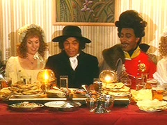 Meanwhile, Kryten was fuming at having his dinner party ignored and followed his shipmates into the scenario. He stalked the group through the forest, picking off Jane and Elizabeth with a blowgun and various traps. After his attempt to waylay Mary failed, he abandoned subtlety and borrowed a T-72 Tank from a World War 2 game. As the tea party was in full swing, Kryten emerged from the nearby lake driving the tank. After declaring "Supper is Ready", he used the tank's main gun to obliterate the gazebo, leaving only his shipmates sitting in a smoking ruin. Lister says that he "didn't know robots got PMT".