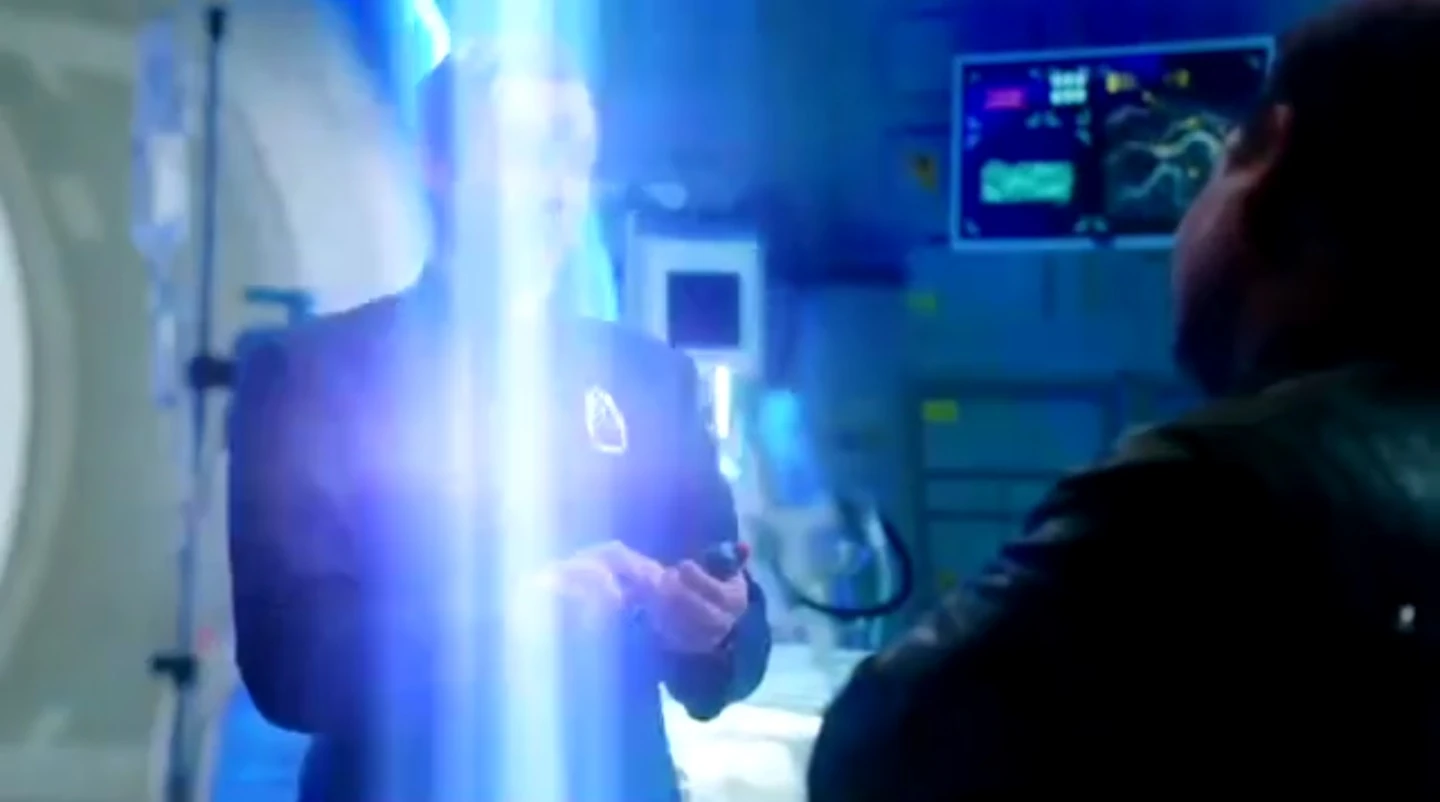 Arnold Rimmer activates the Quantum Skipper for the first time, disappearing in a flash of blue light