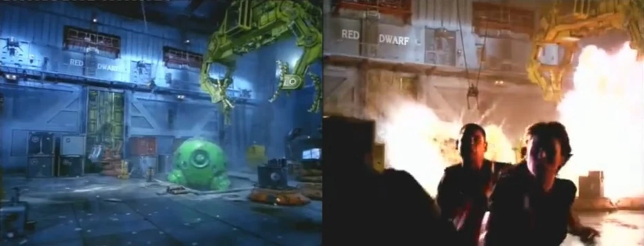 - The original iteration of Lister and Rimmer's sleeping quarters (not seen since Series II) are also recreated by the nanobots, and Lister is held there briefly under house-arrest (the set was recreated from the originals). This is the last time the original iteration of the sleeping quarters are seen in the show until Rimmer travels to an alternative universe in the Series XII finale "Skipper".