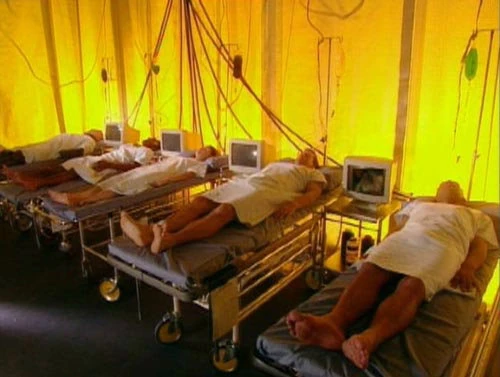Below, the crew are welcomed by Warden Ackerman (Graham McTavish) to 'The Tank'. While this is going on Lister, still in possession of the sexual magnetism virus, empties the tube over Rimmer as revenge for his actions earlier. Rimmer then realises that he's becoming very popular with certain rough segments of the male inmates.