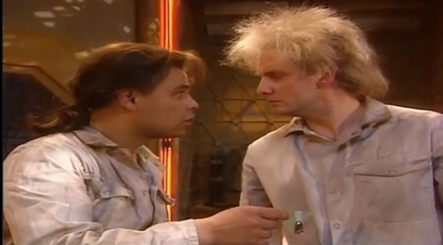 Instead of finding themselves in little pieces, they wake to discover that for four years they have been playing the Total Immersion Video Game version of Red Dwarf the Game. Everyone now looks different; Lister has a ponytail, Rimmer has large white hair, Kryten is half-human, and Cat has a bowl haircut and a massive overbite. Before their real memories have returned, Andy the Techie informs them that they only scored four percent in four years of playing, completely failing to notice the most basic of clues, and then moves them on to the recuperation lounge, whilst a new, hunky group of Dwarfers begin playing the Red Dwarf game, much more successfully than the last, with the new action-hero Lister saving Kochanski and winning her back early on.