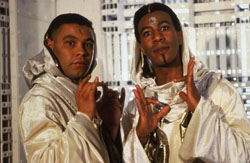 They first visit the "High" version of Red Dwarf, which has relaxing music, bright surroundings and purer air. It even has, to Lister's surprise, an edible Pot Noodle. They are also met by their "higher selves", white robe wearing versions of themselves which contain all the best of them, spending their time on philosophy and the performing arts (much to Rimmer's disgust). Together they find out that the Triplicator on this ship is lacking half of it's components, so they and the "High" crew are forced to go to the other ship.