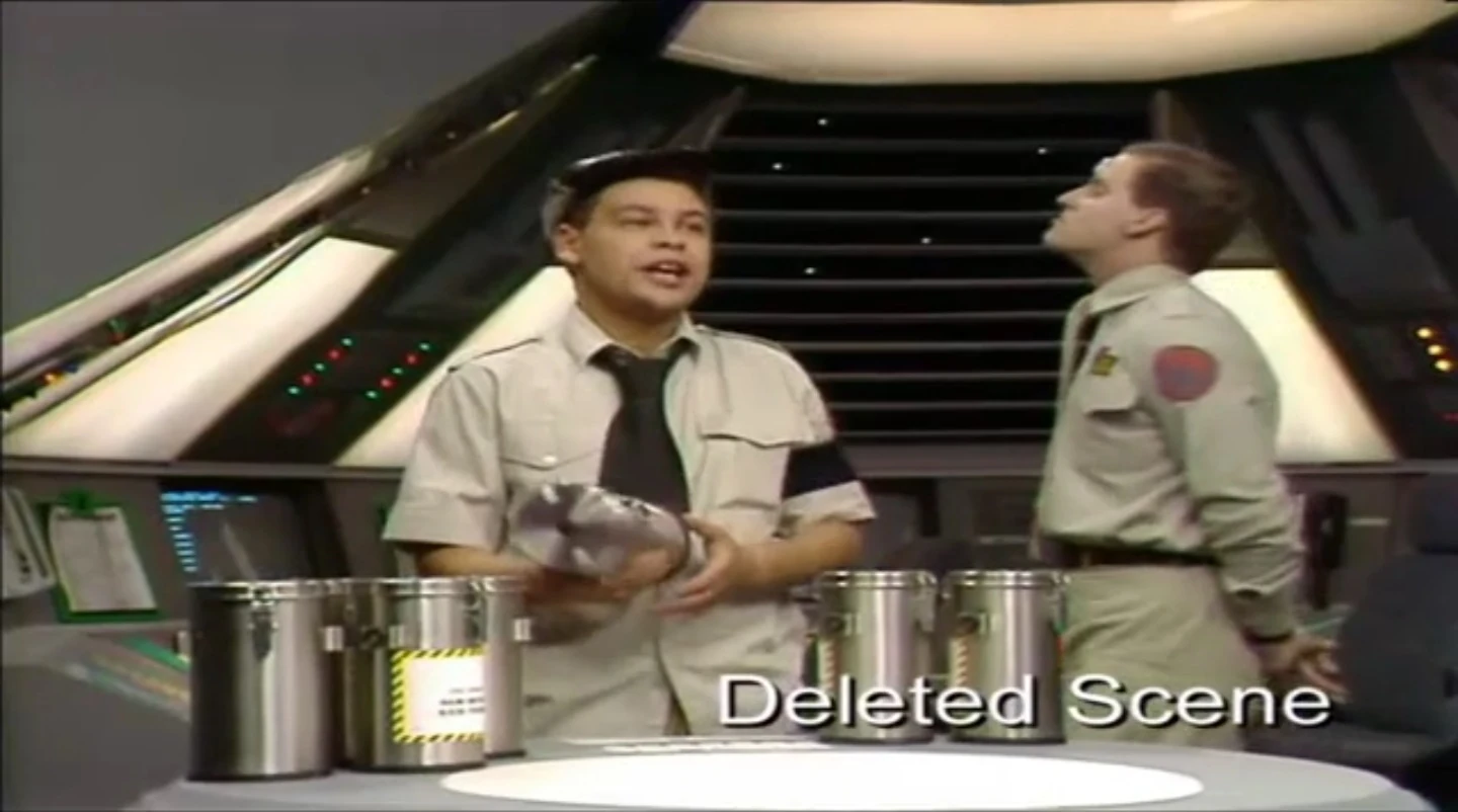 - An extended scene with Lister and navigation officer Kristine Kochanski flirting in the Drive Room as Lister is on the way to the captain's office. Lister plays with the controls to her chair, dropping her down. The scene was excised due to the actors not feeling it was genuine-feeling and even "embarrassing" and "nauseating".