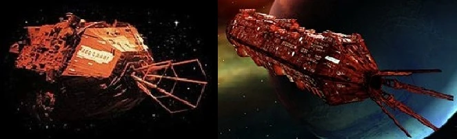 Red Dwarf as it originally appeared, and later in the remastered version. The latter version was also used for the nanobot-upgraded ship in Series VIII.