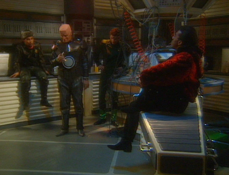 While Kryten and Rimmer are on their way back from the cargo bays with food and supplies, they begin experiencing strange time distortions: on one side of the hall time is sped up while on the other it's slowed down. While explaining it to Lister and Cat, the place in the conversation they're having jumps around, causing the conversation to go on indefinitely. As time constantly rewinds to the beginning of the conversation, Cat repeatedly asks what the distortions are. Kryten eventually gives the explanation for this - the solar system Red Dwarf is passing by contains a a White Hole, the opposite of a Black Hole, which is spewing time and matter chaotically into the space around it.