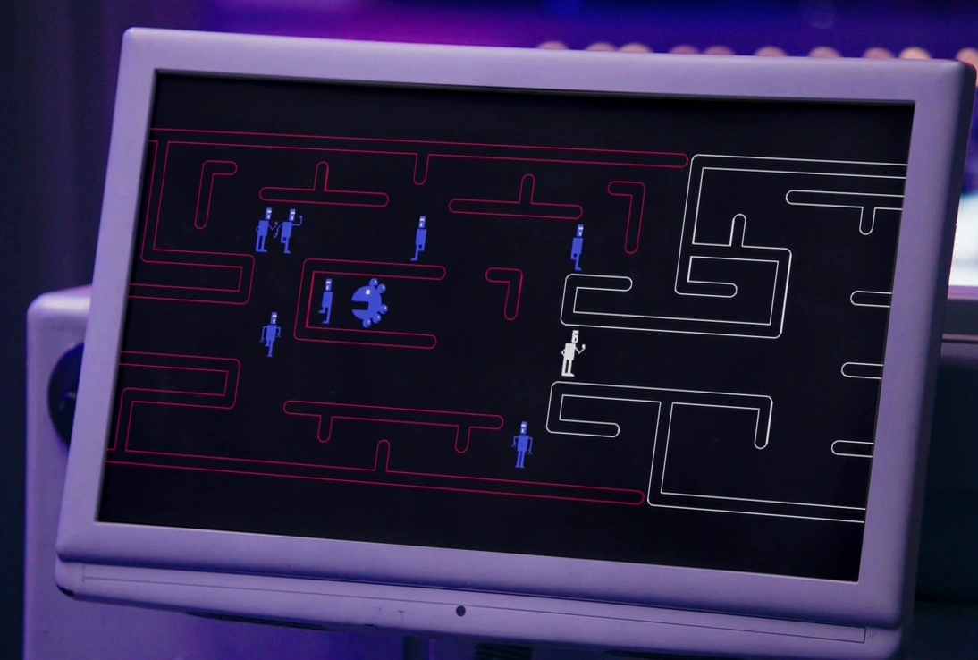 As the various bio-printed Rimmer clones were being chased by the Rimmer Monster through the ship, the other Dwarfers watched a visual representation of this on the internal scanners in the Science Room. This resembled Pac-Man. ("Officer Rimmer", Series XI)